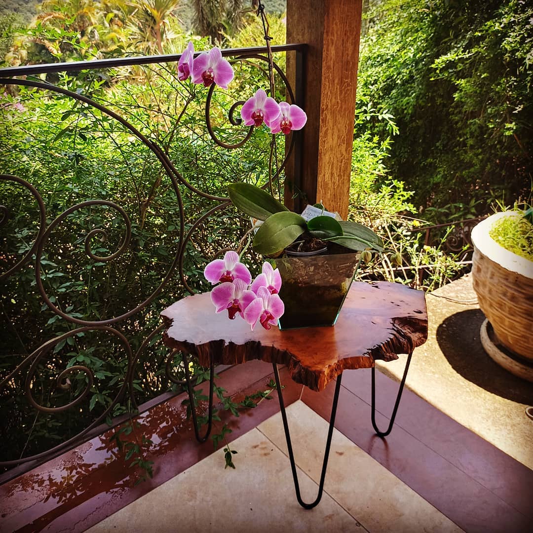 Mesa de canto rústica de tronco, em bolacha de tora de madeira com pés em ferro.