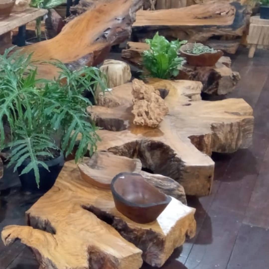 Mesa de centro em tora de tronco e raiz de árvore, para receber na sala, varanda ou recepção de escritório ou consultório.